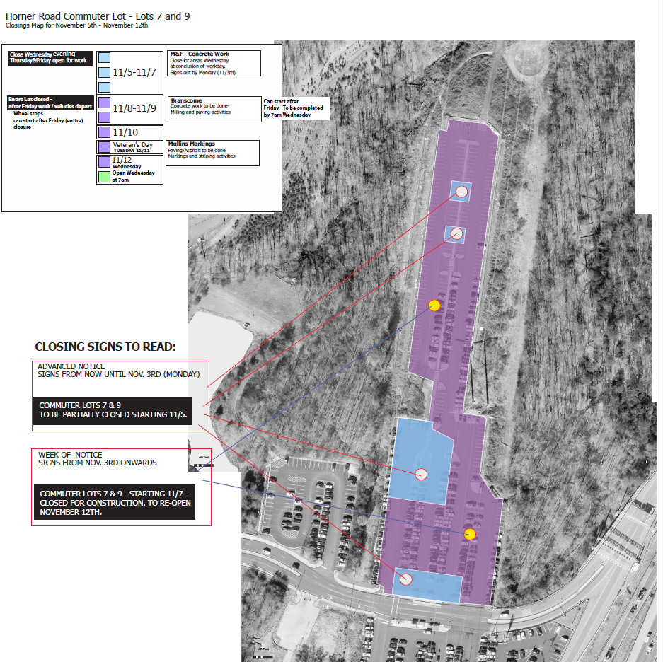 Beginning Wednesday, November 5th through Wednesday November 12th, Prince William County DOT and VDOT will be restriping and repaving Lots 7 and 9 at the Horner Road Commuter Lot. During this time, this lot will be inaccessible for parking. Passengers should use other open spaces available at the commuter lot, or park at the Telegraph Road Commuter Lot.